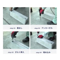 ・1本のタイガーベースを2本のボルトでコンクリート土間にアンカー固定できます。アンカー固定により高い耐震施工を実現しました。公共工事(学校等)で耐震補強工事等、タイガーベースを土間に固定する現場で使用いただいております。