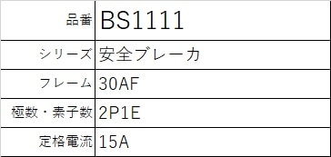 メーカー名:パナソニック 型式:BS1111 極数・素子数:2P1E 定格電流(A):15 |