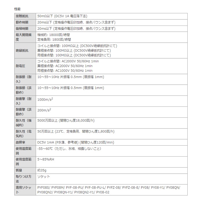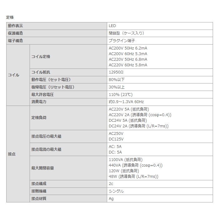 ・接点定格負荷:AC220V 5A (抵抗負荷) / AC220V 2A (誘導負荷(cosφ=0.4)) / DC24V 5A (抵抗負荷) / DC24V 2A (誘導負荷(L/R=7ms))